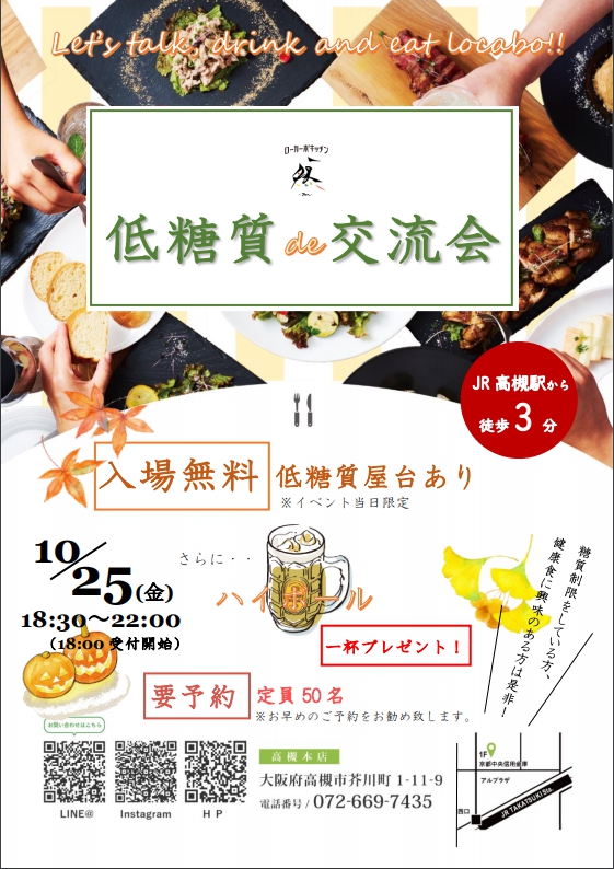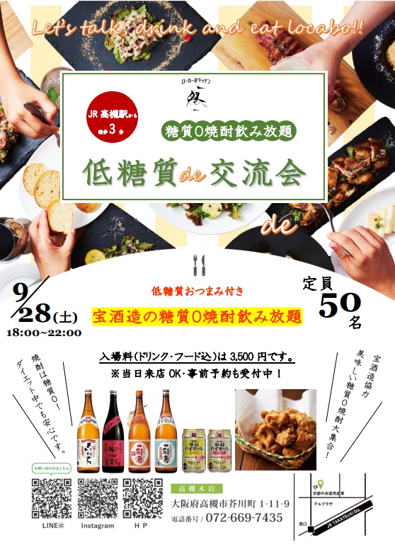 9月28日(土)18:00~22:00、高槻本店にて公式イベント「低糖質de交流会 ~宝酒造の糖質0焼酎飲み放題~」を開催致します!!